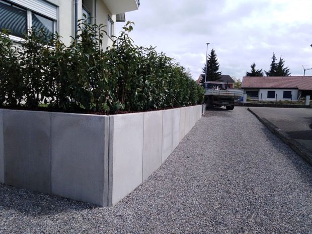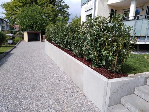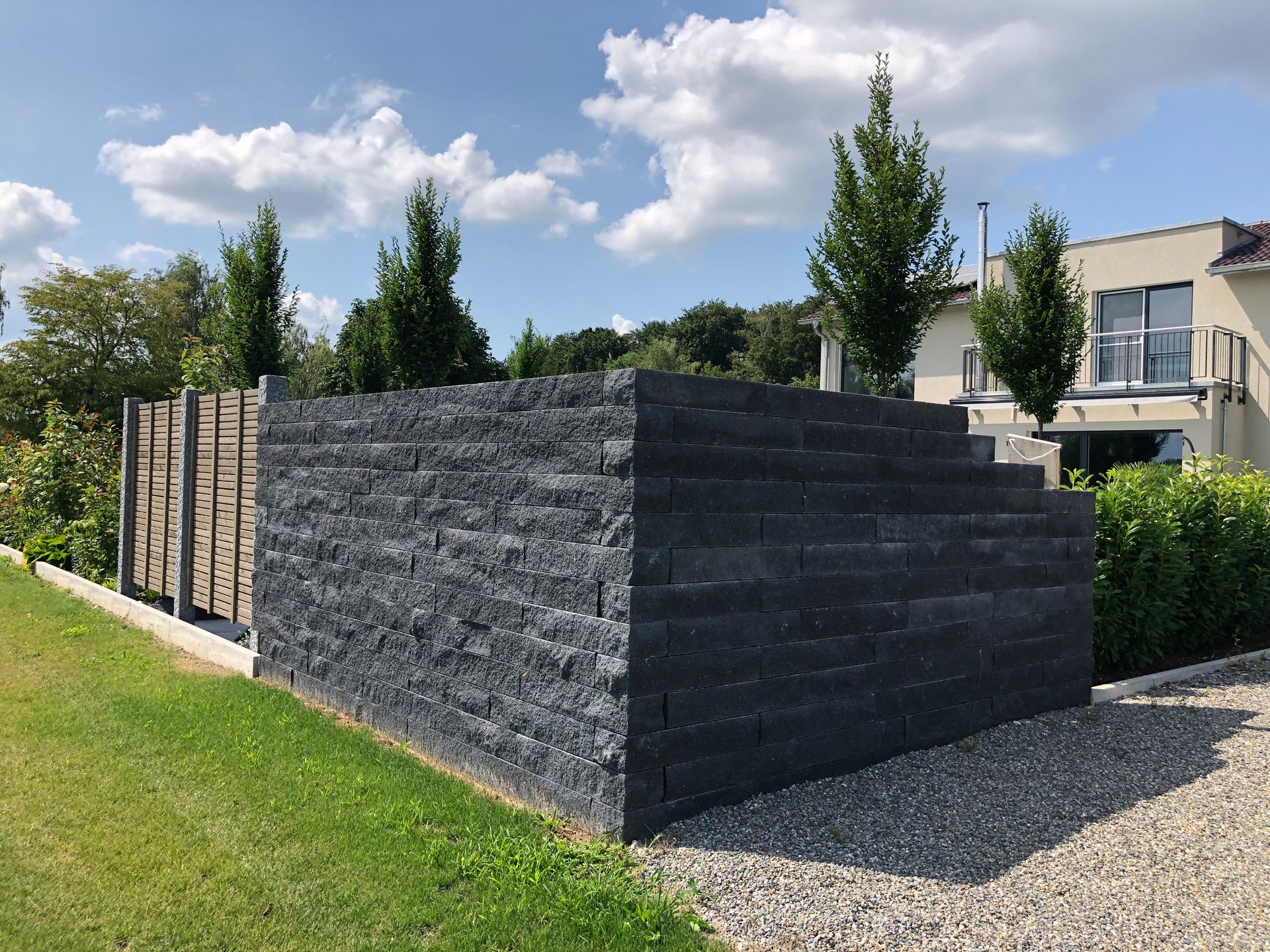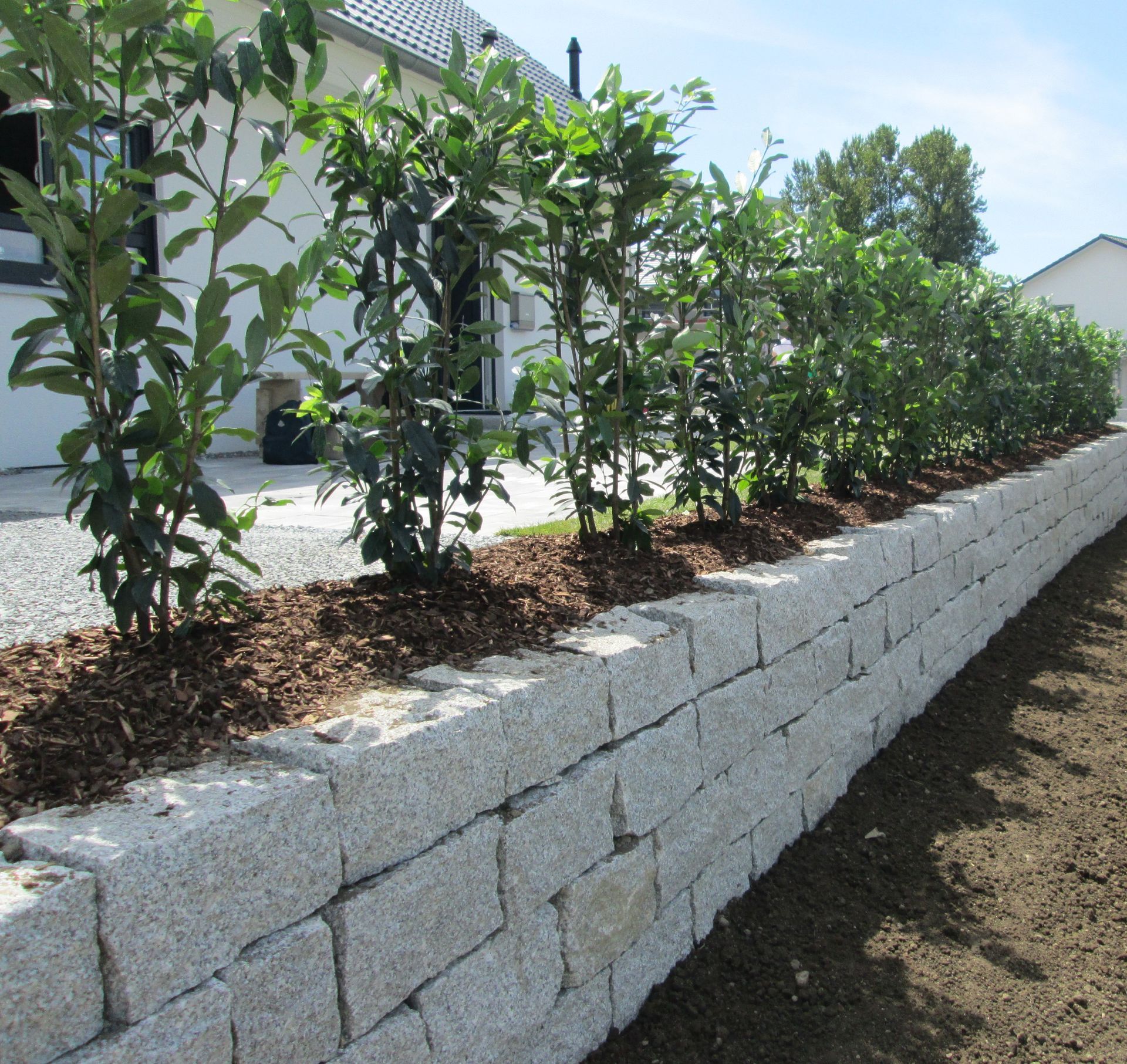 Eine Steinmauer umgibt einen Garten mit Bäumen und Sträuchern