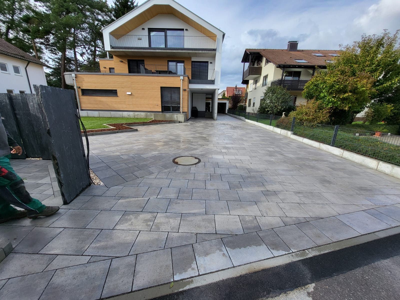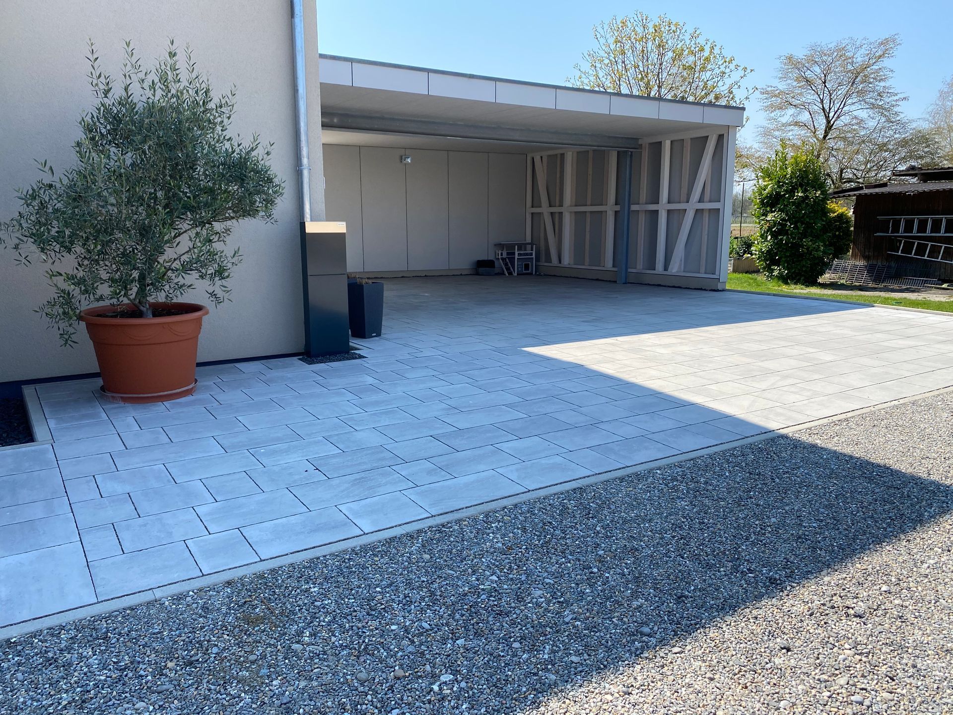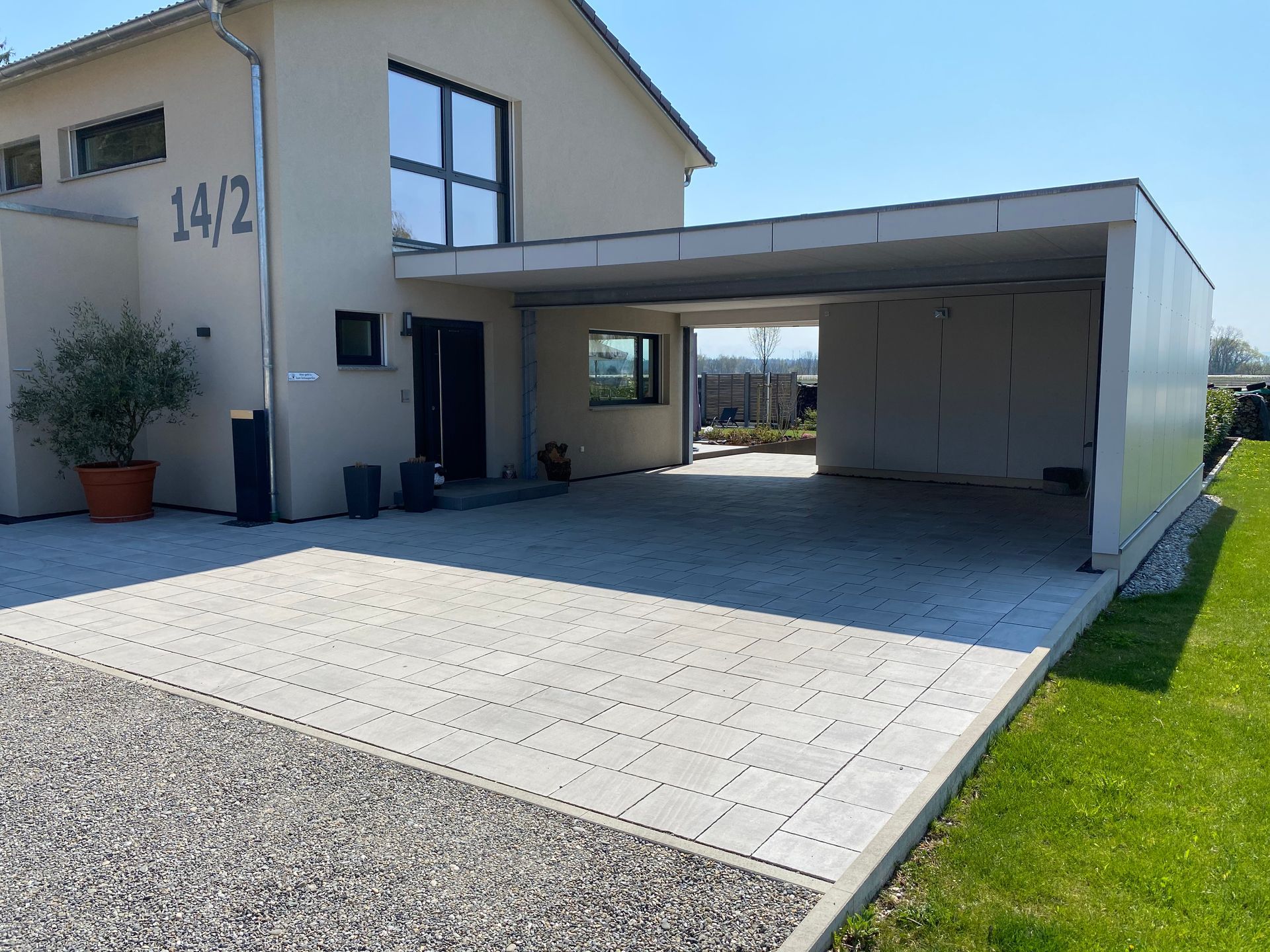 Ein Auto steht in einer Einfahrt neben einer Garage