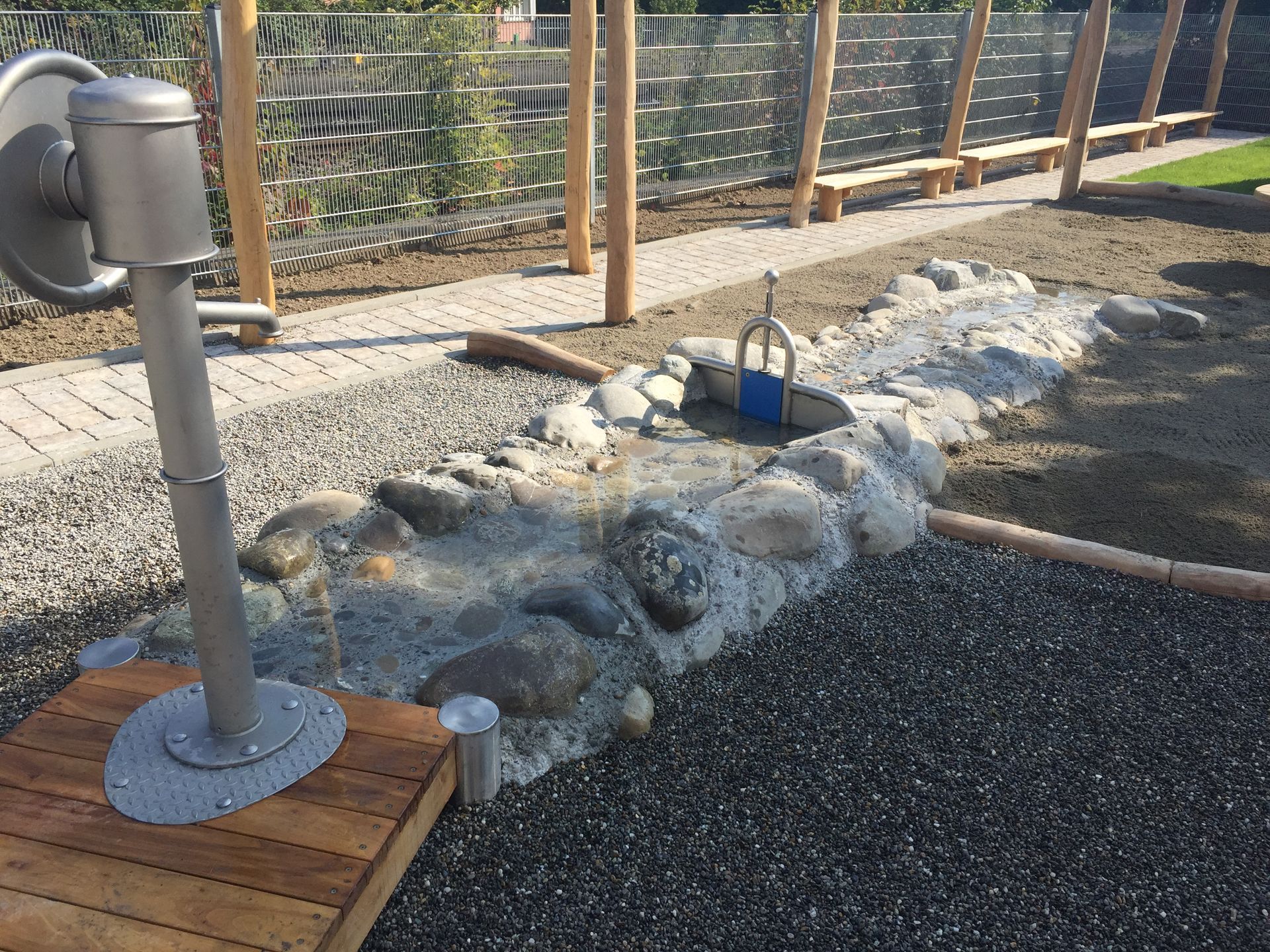Ein Garten mit einem Teich und einem Zaun darum herum.