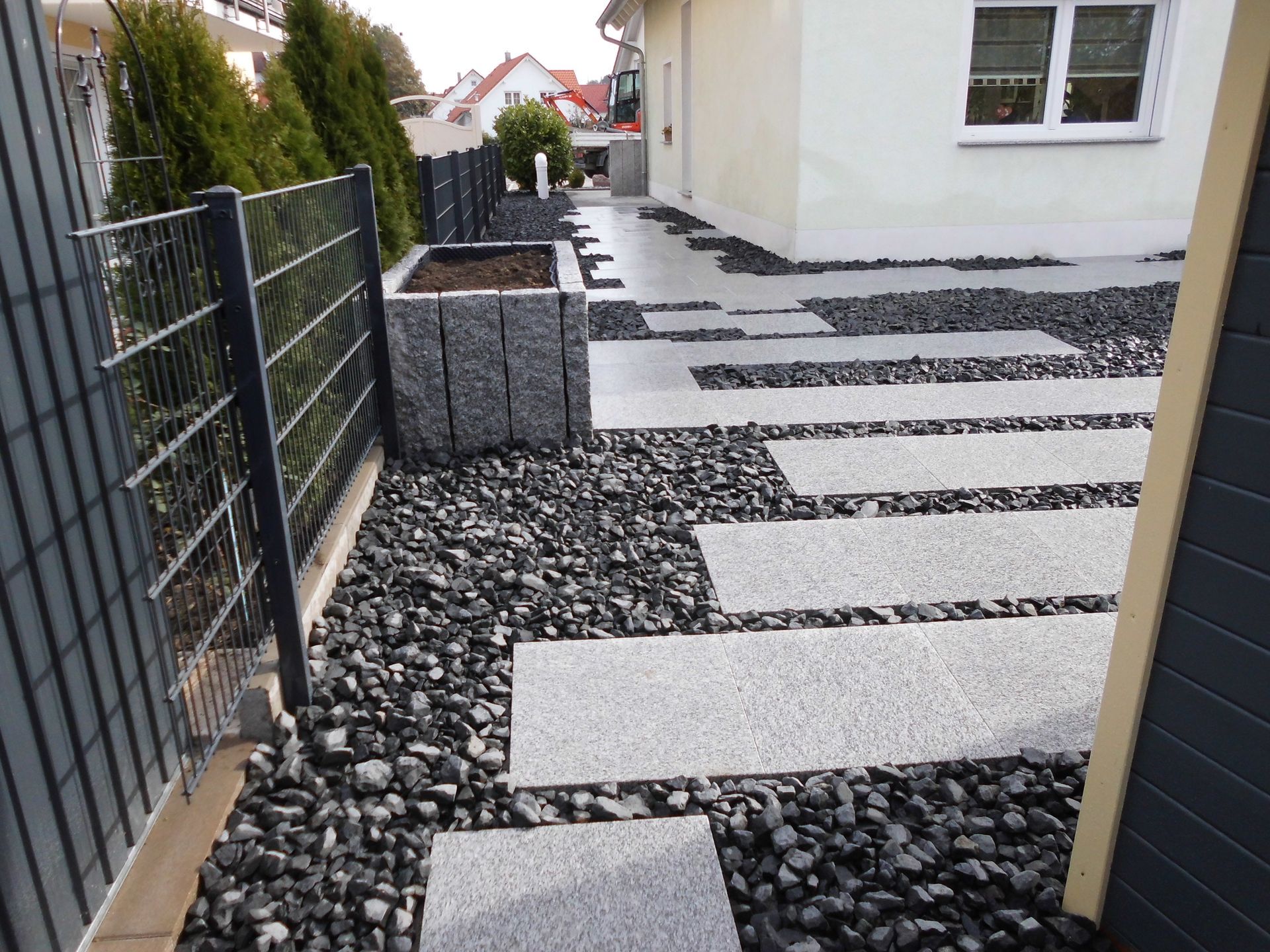 Ein Steinweg vor einem Haus mit Topfpflanzen und Blumen.